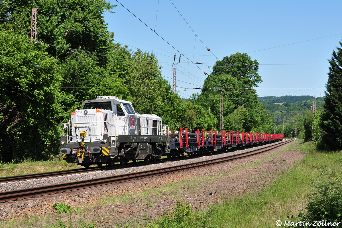 Mit dem "Grüner Stahl"-Stabstahlzug ist die geleaste DE 18 der VLO am Mittag des 19. Mai 2025 im Iserlohner Ortsteil Lasbeck in den Resten des ehemaligen Bahnhofs Nachrodt unterwegs Richtung Zielbahnhof Plettenberg. Auch die Oberleitung soll noch von Turmmasten auf normale Streckenmaste zurückgebaut werden, sodass hier nur noch "Freie Strecke" übrig ist.