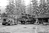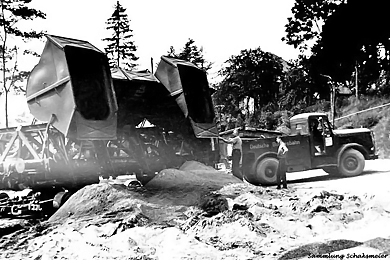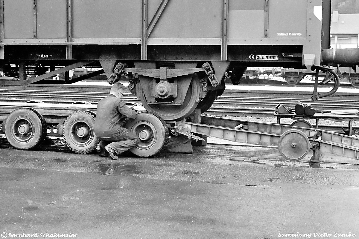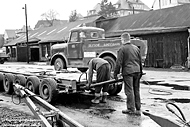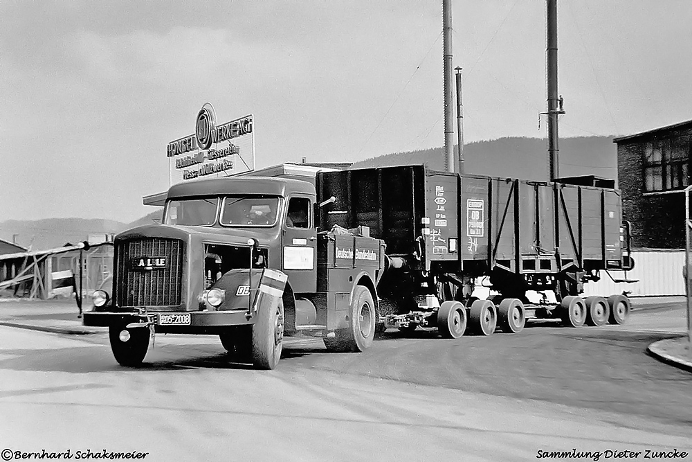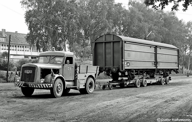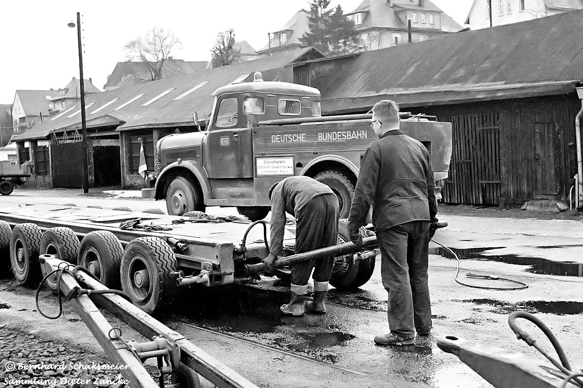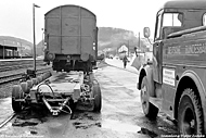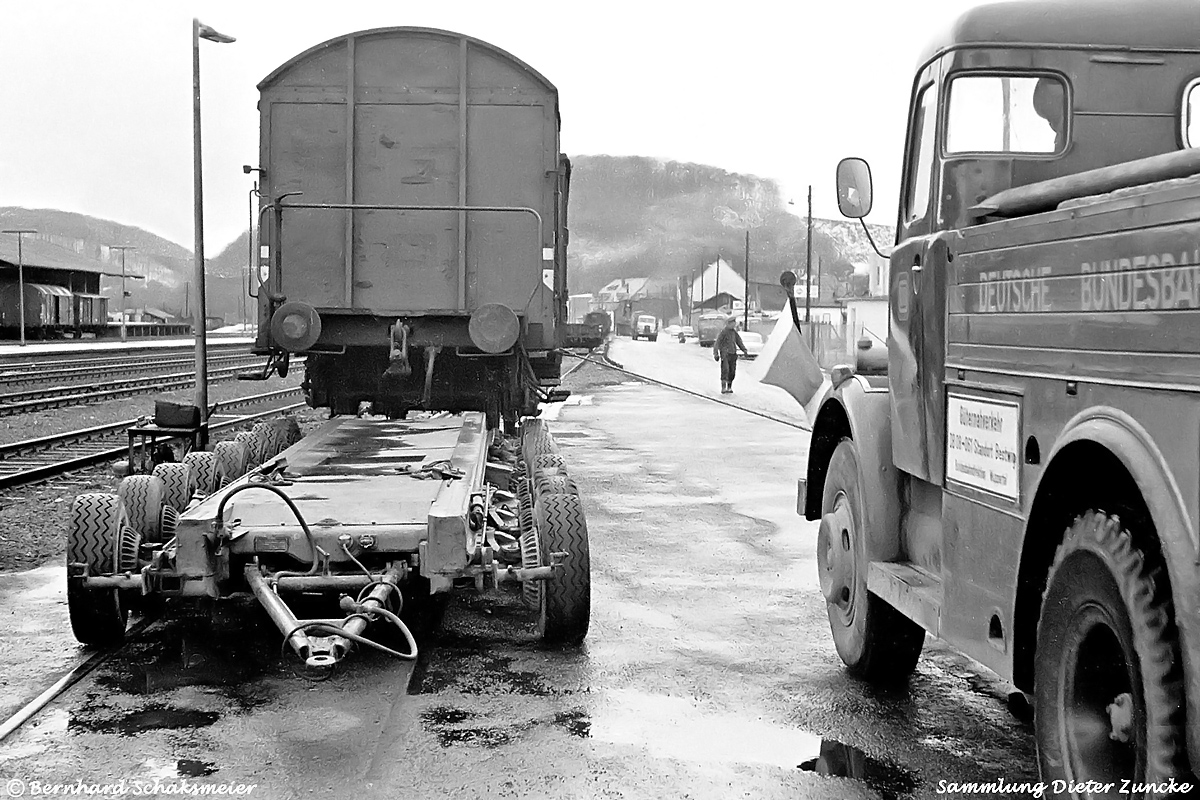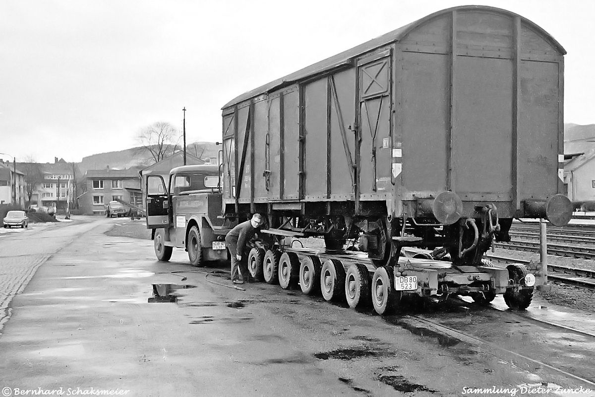 Im Winter 1967 war Bernhard Schaksmeier mit seiner Kamera in Meschede vor Ort und konnte die Auflastung eines G-Wagens im Bild festhalten (Aufnahmen aus der Sammlung Zuncke). Als Zugfahrzeug kam eine 230 PS starke Kaelble-Zugmaschine vom Typ K 632 ZB ⁄ 12 aus der 12. Bauserie von 1964 mit DB-Zulassungnummer DB 47-438 zum Einsatz.
