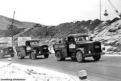Auch beim Neubau der Hennetalsperre (Ersatz der alten, undichten Staumauer von 1905) in den Jahren 1952 bis 1955 konnte für anfallende Materialtransporte nicht auf die Kaelble-Gespanne verzichtet werden. Teilweise in Doppel- bzw. Dreifachbespannung oder mit Schiebezugmaschine traktioniert, kamen sogar Drehgestellwagen an verschiedenen Stellen des Baugrundes zur Zustellung, wie die folgenden Aufnahmen zeigen: