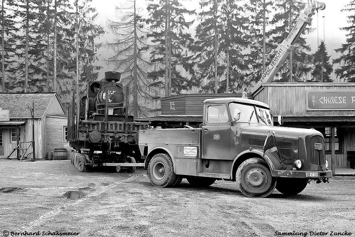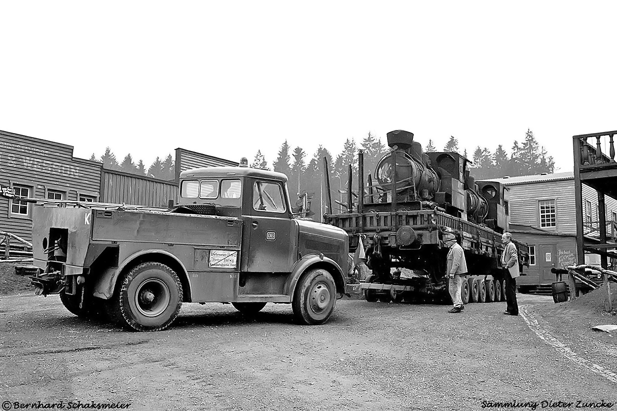 Neben den planmäßig bedienten Relationen erreichten die Schwertransporte teilweise auch einmalig "exotische" Ziele, wie die folgenden Bilder aus dem Jahr 1977 zeigen. Das Fort Fun-Abenteuerland in Bestwig-Wasserfall hatte für die geplante Eröffnung einer Westerneisenbahn beim Stahlwerk Donawitz in der österreichischen Steiermark zwei 790mm Krauss-Dampfloks (Lok 100.2 und 100.4) erworben. Die Anlieferung erfolgte auf einem DB-Kbs-Wagen, welcher per Roller im Freizeitpark zugestellt wurde. Die Traktion des Gespanns war der 270 PS starken, im Jahr 1971 aus der 15. Serie gebauten Kaelble (Kennzeichen DB 47-530) vom Typ K 632 ZB ⁄ 15 übertragen. Die Entladung des Waggons erfolgte dann per Autokran.