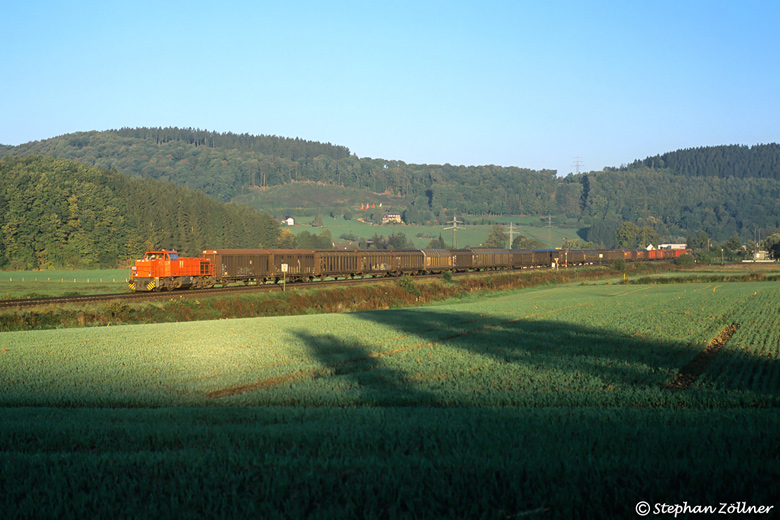 Gleich in der ersten Einsatzwoche der G 1206 Leihloks bei DB Railion im Sauerland Anfang September 2006 gab es viel Sonnenschein, welcher auch zu einigen Aufnahmen genutzt werden konnte. Am 06.09. war dem Eggerzug die RAG 832 vorgespannt, die nach Unterquerung der Roten Brücke in Olsberg mit einer langen Schlange H-Wagen auf den Mittelformatdiafilm wanderte. Der am Morgen noch vorhandene Tau in der Wiese machte die zahlreich vorhandenen Spinnennetze gut sichtbar.