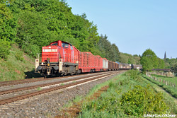 Am 15. Mai 2013 gab es mal wieder einen als Sonderleistung eingelegten Rohholzzubringer gen Brilon. Während auf der linken Aufnahme der Planzug mit 225 023 bei Echthausen talwärts rollt, kommt kurz darauf eine kleine Voith Gravita in Form von 261 085 mit dem Rohholzsonderzug bergwärts entgegen. Der Treffpunkt dieser Züge lag immer im Bereich Fröndenberg ⁄ Langschede.