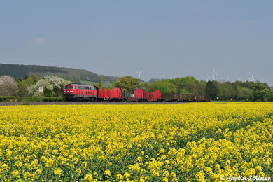 Die freie Fläche in der Echthausener Gemarkung animiert zu jahreszeitlich geprägten Motiven: Im Mai steht wenige Tage der Raps in voller Blüte. 225 024 rollt am 04. Mai 2013 vorbei. Im Oktober kann man(n) Hagebutten ernten, oder sie als Bildvordergrund für 265 028 mit dem Eggerzug nutzen (24.10.2014).