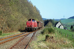 Kurz vor der Ruhrbrücke in Wennemen konnte am Mittag des 10. Mai 1993 die Hagener 211 278 mit der aus Schmallenberg zurückkehrenden Übergabe 69981 an der dortigen Löwenzahnwiese im Bild festgehalten werden. An diesem Tag war nur ein leerer Ghkkms in der Version mit Bremserhaus nach Bestwig zu bringen.